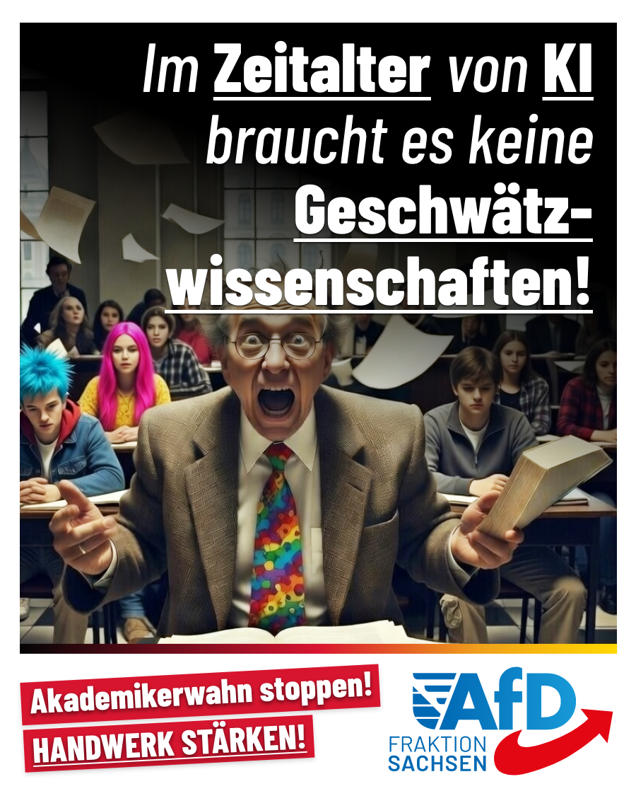 „In Sachsen gibt es über 100.000 Studenten. Das ist aus Sicht der AfD zu viel. Wir brauchen zwar zwingend die 10.000 Studenten in Mathematik und Naturwissenschaften. Vollkommen in Ordnung sind auch die rund 7.500 Studenten in den Gesundheitswissenschaften und die knapp über 30.000 angehenden Ingenieure.