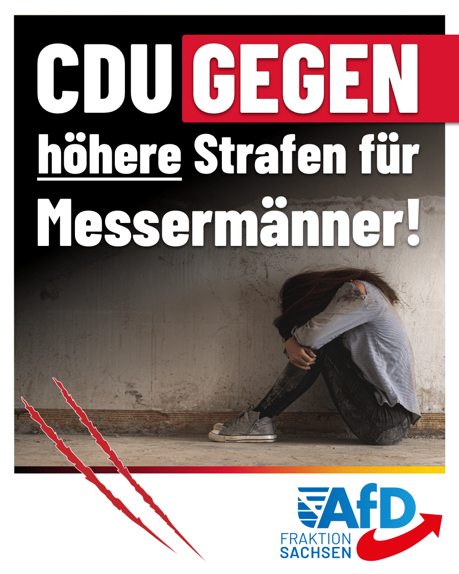Die sächsische AfD-Fraktion will Messergewalt härter bestrafen. Es sollte in Zukunft der Grundsatz gelten: Wer mit einem Messer angreift, nimmt tödliche Verletzungen in Kauf. Deshalb kommt in solchen Fällen nur eine Gefängnisstrafe in Betracht! Am 26. März wird darüber im Landtag abgestimmt (Drs. 8/5618).
