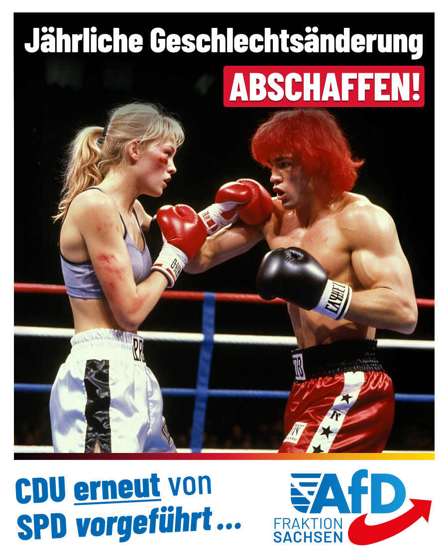 In einem Antrag (Drs. 8/4556) fordert die sächsische AfD-Fraktion die Abschaffung der jährlichen Geschlechtsänderung bereits ab dem 14. Lebensjahr.