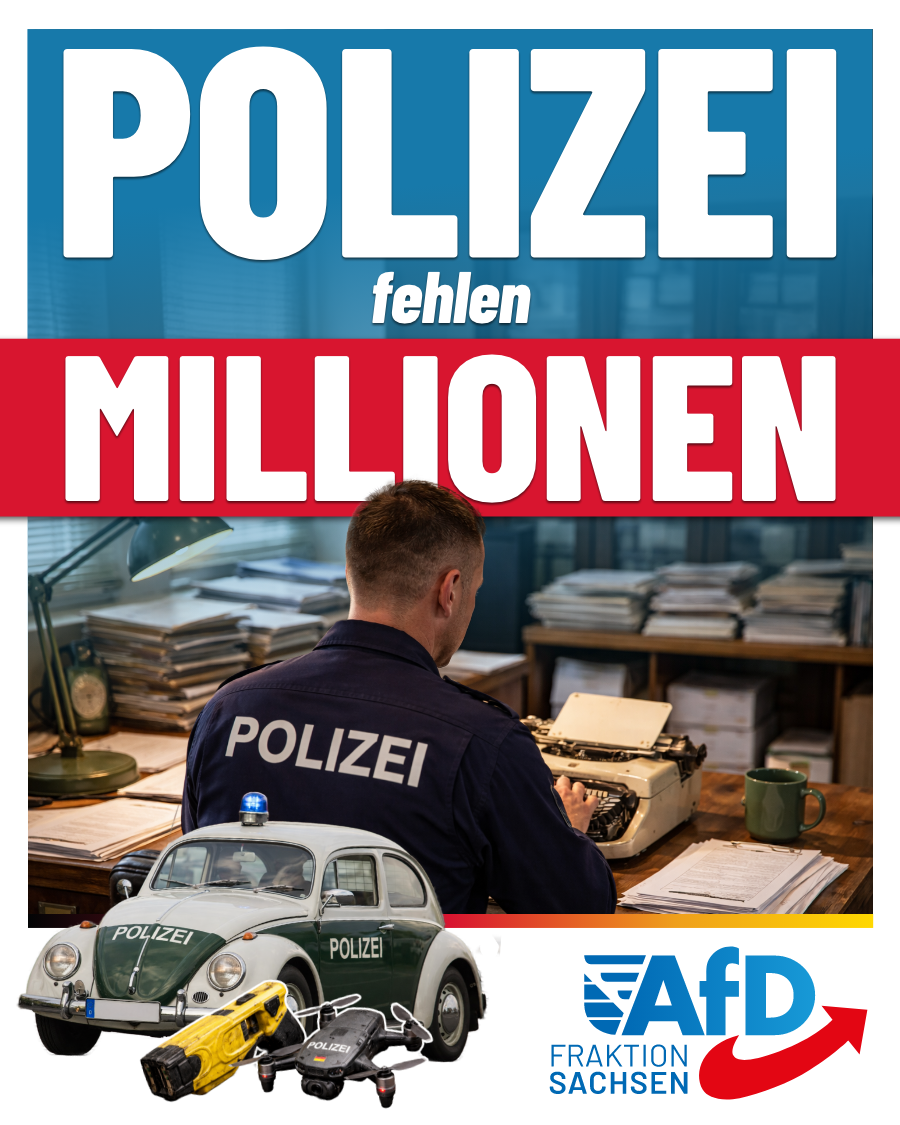 „Die sächsische Polizei ist chronisch unterfinanziert. Wenn das Geld – nach aktuellem Stand 60 Millionen Euro – fehlt, dann arbeiten die sächsischen Polizisten mit veralteten Computern, Waffen und Polizeiwagen. Taser, die zur Abwehr besonders gefährlicher Gewalt- und Messertäter geeignet sind, stehen nicht ausreichend zur Verfügung. Das kann niemand wollen. Die sächsische Polizei muss dringend besser ausgestattet werden!