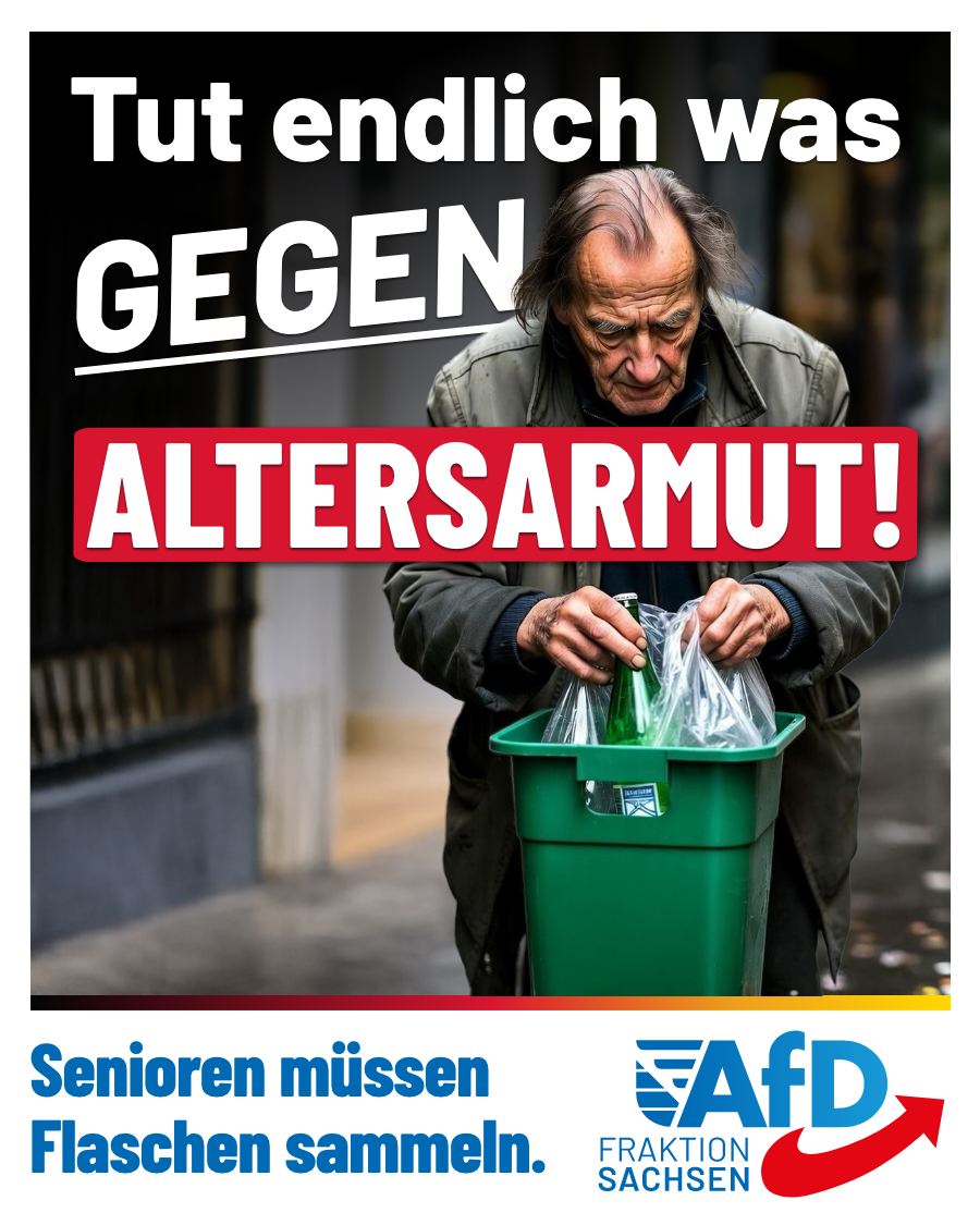 „Seit vielen Jahren ist bekannt, dass die Altersarmut rasant steigt“, erklärt der sächsische AfD-Fraktionsvorsitzende Jörg Urban. „CDU und SPD haben jedoch nichts, wirklich gar nichts getan, um dieses Problem wenigstens einzudämmen. Das empfinde ich für ein wohlhabendes Land wie die Bundesrepublik als Schande!